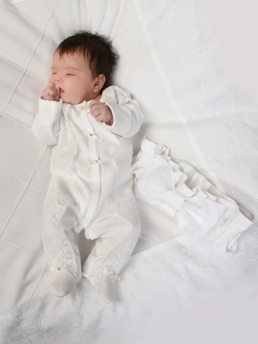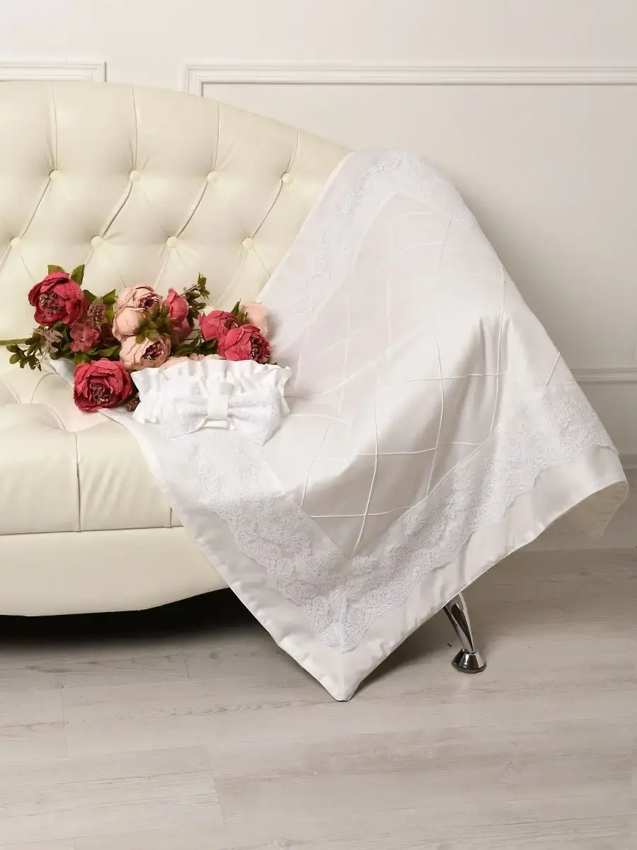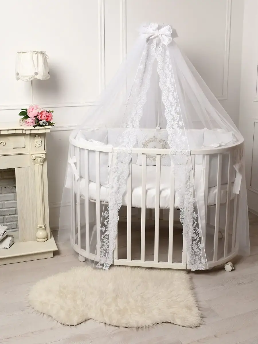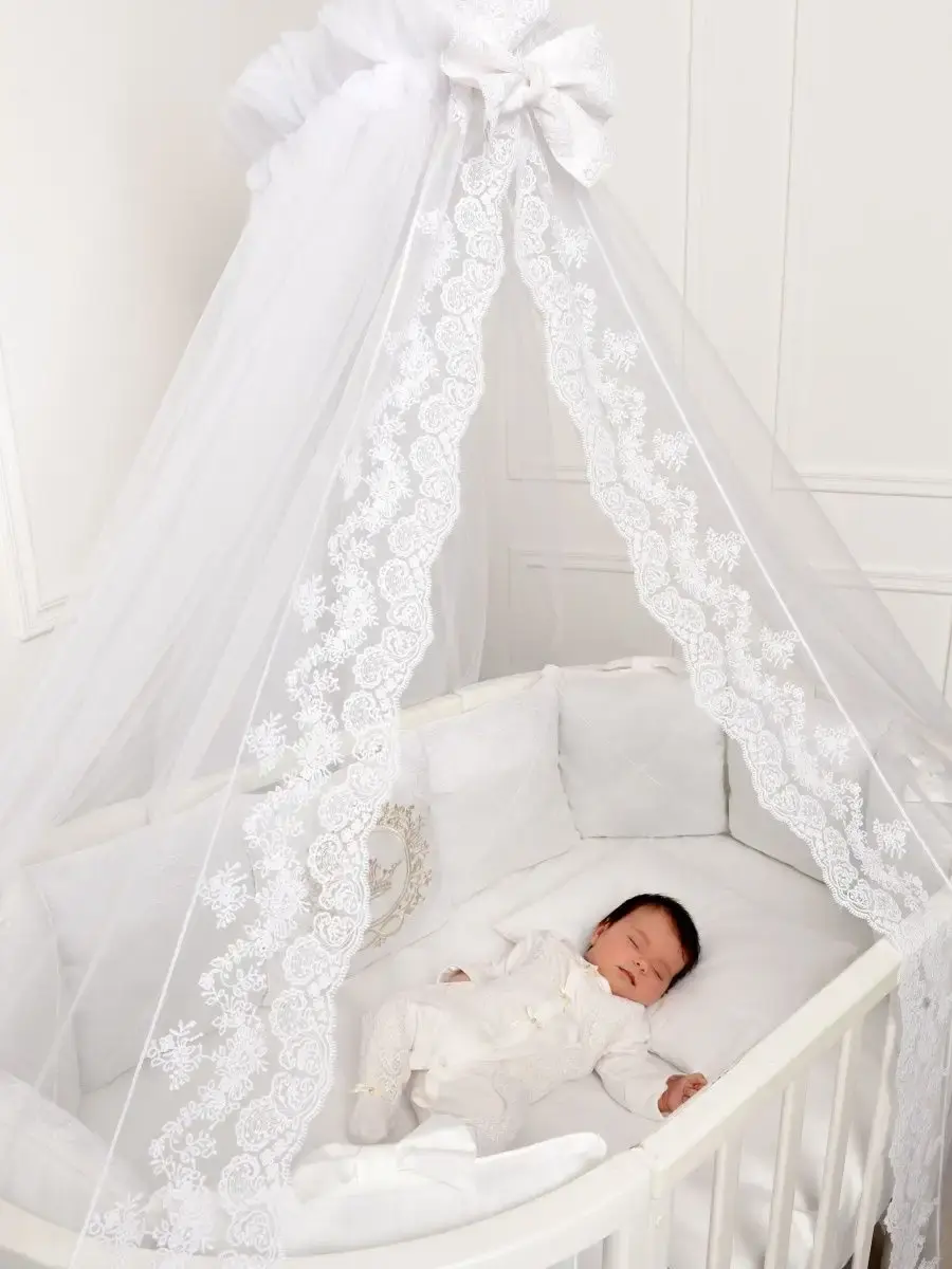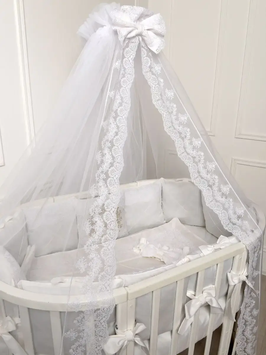 Комплект постельного белья для новорожденного подходит для круглой, овальной, классической кроватки. Исключительную ценность для безопасности ребенка составляют бортики для детской кроватки со съемными чехлами на молнии, которые сгладят любое неосторожное движение малыша во время сна. Бортики креаятся к кроватке бантами-завязками из основной ткани. Комплект в кроватку выполнен из сатина. Комплект постельного белья для новорожденного декорирован кружевом и изысканной машинной вышивкой и, что придает по-настоящему королевский, аристократический вид. Одеяло вы сможете использовать как конверт на выписку. Бант на резинке для конверта на выписку входит в комплект для новорожденного. Нас ищут: бортики в кроватку, конверт на выписку, комплект на выписку, бортики для детской кроватки, бортики, постельное белье для новорожденных, комплект на выписку новорожденных. Балдахин и кружевной уголок Вы можете приобрести ДОПОЛНИТЕЛЬНО!