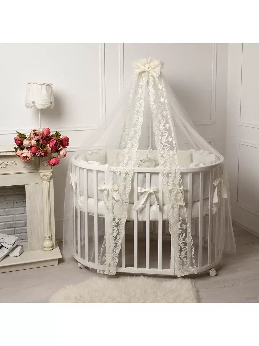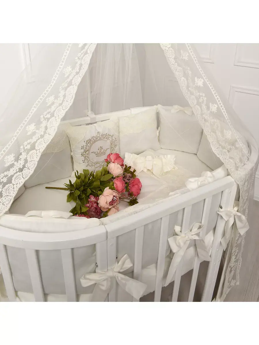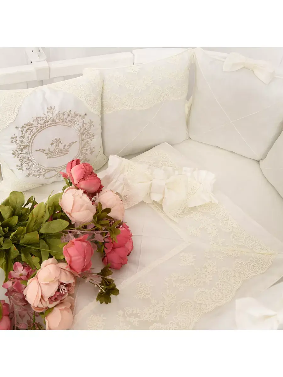 Комплект постельного белья для новорожденного подходит для круглой, овальной, классической кроватки. Исключительную ценность для безопасности ребенка составляют бортики для детской кроватки со съемными чехлами на молнии, которые сгладят любое неосторожное движение малыша во время сна. Бортики креаятся к кроватке бантами-завязками из основной ткани. Комплект в кроватку выполнен из сатина. Комплект постельного белья для новорожденного декорирован кружевом и изысканной машинной вышивкой и, что придает по-настоящему королевский, аристократический вид. Одеяло вы сможете использовать как конверт на выписку. Бант на резинке для конверта на выписку входит в комплект для новорожденного. Нас ищут: бортики в кроватку, конверт на выписку, комплект на выписку, бортики для детской кроватки, бортики, постельное белье для новорожденных, комплект на выписку новорожденных. Балдахин и кружевной уголок Вы можете приобрести ДОПОЛНИТЕЛЬНО!