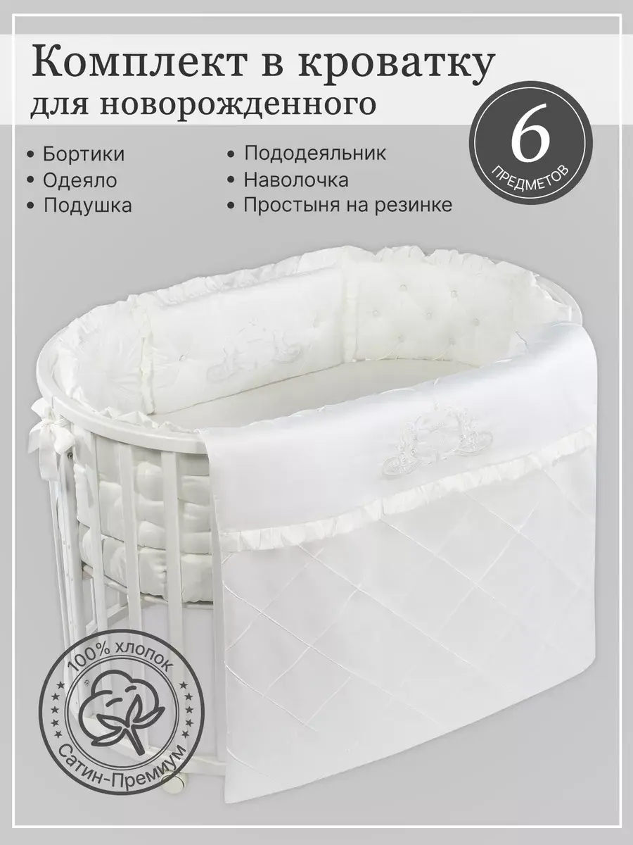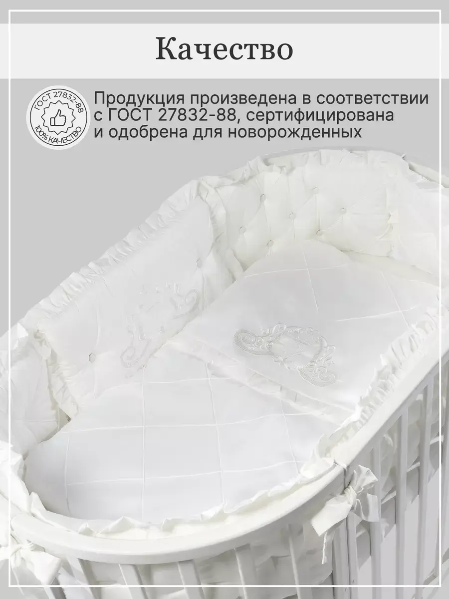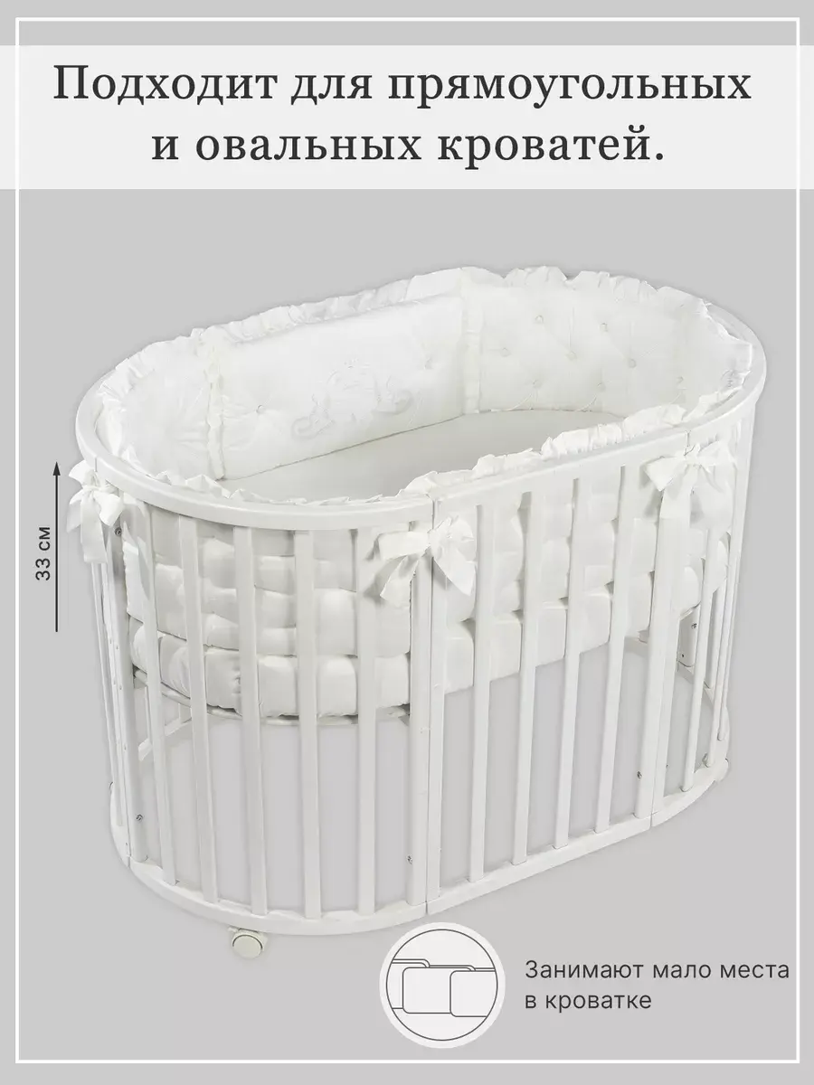 Бортики в кроватку для новорожденных из высококачественного сатина - это идеальный выбор родителей для которых важна красота, удобство и качество. Бортики для детской кровати должны быть максимально безопасными, поэтому в качестве наполнителя использован холлофайбер 600 грамм. Постельное белье декорировано изысканной вышивкой. Бортики выполнены по технологии "каретная стяжка". Они не имеют съемных чехлов, но при этом прекрасно стираются при температуре 30С. Комплект в кроватку для новорожденного подходит для круглой, овальной и прямоугольной кроватки.