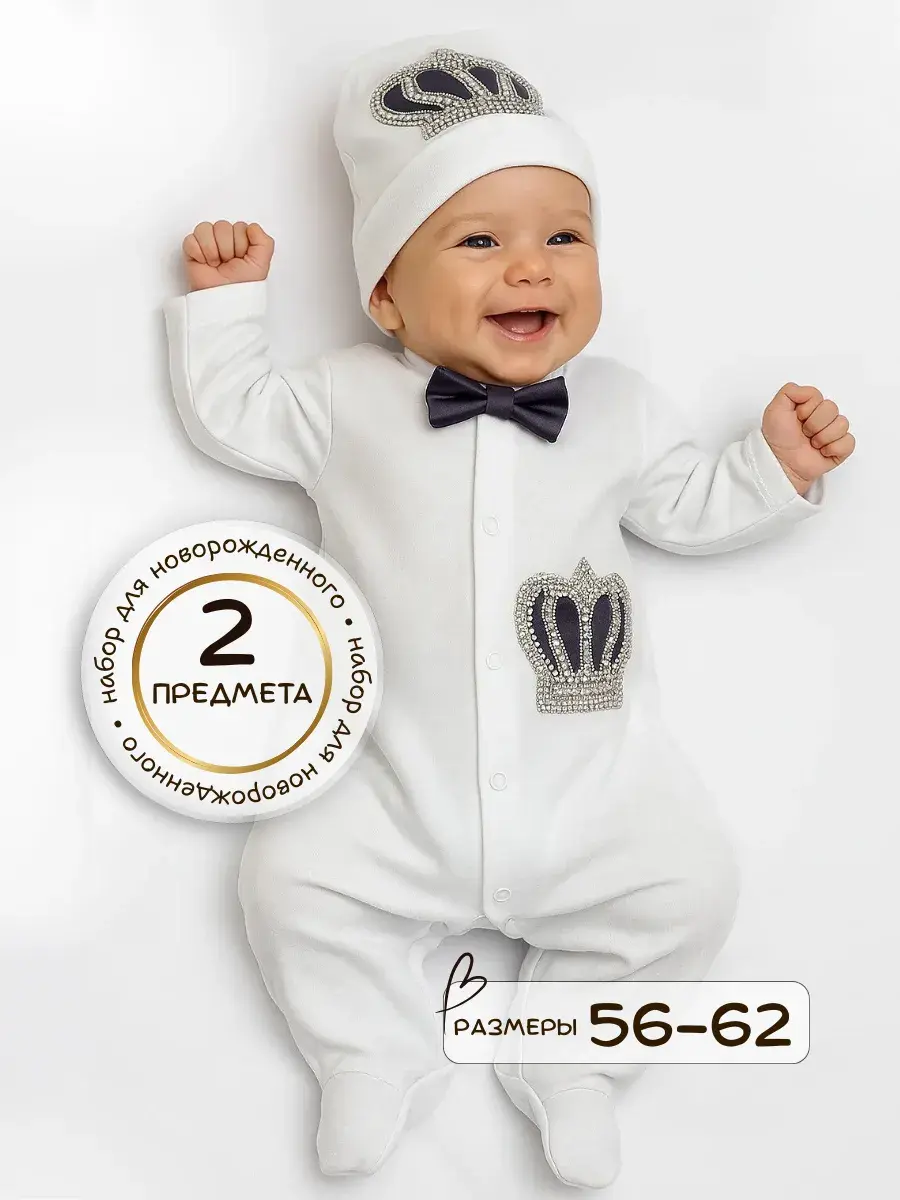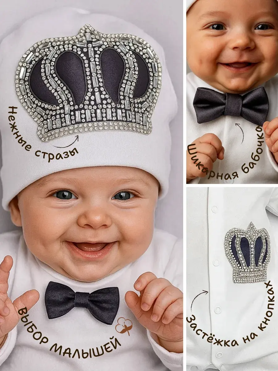 Представляем вам восхитительный комплект на выписку новорожденного от PATRINO, созданный, чтобы сделать этот особенный день еще более волшебным! Этот нарядный комплект, выполненный из нежного хлопка, окутает вашего малыша мягкостью и заботой. Слип для новорожденного с длинными рукавами и царапками обеспечит максимальный комфорт, а удобные кнопки по всей длине позволят легко менять подгузник. Корона из страз и атласные банты на шапочке добавят образу неповторимый шарм и сделают вашего малыша настоящим принцем. Этот комплект – идеальный выбор для выписки из роддома, фотосессии или просто для ежедневного использования. Он станет прекрасным подарком на рождение, порадуя молодых родителей и их кроху.