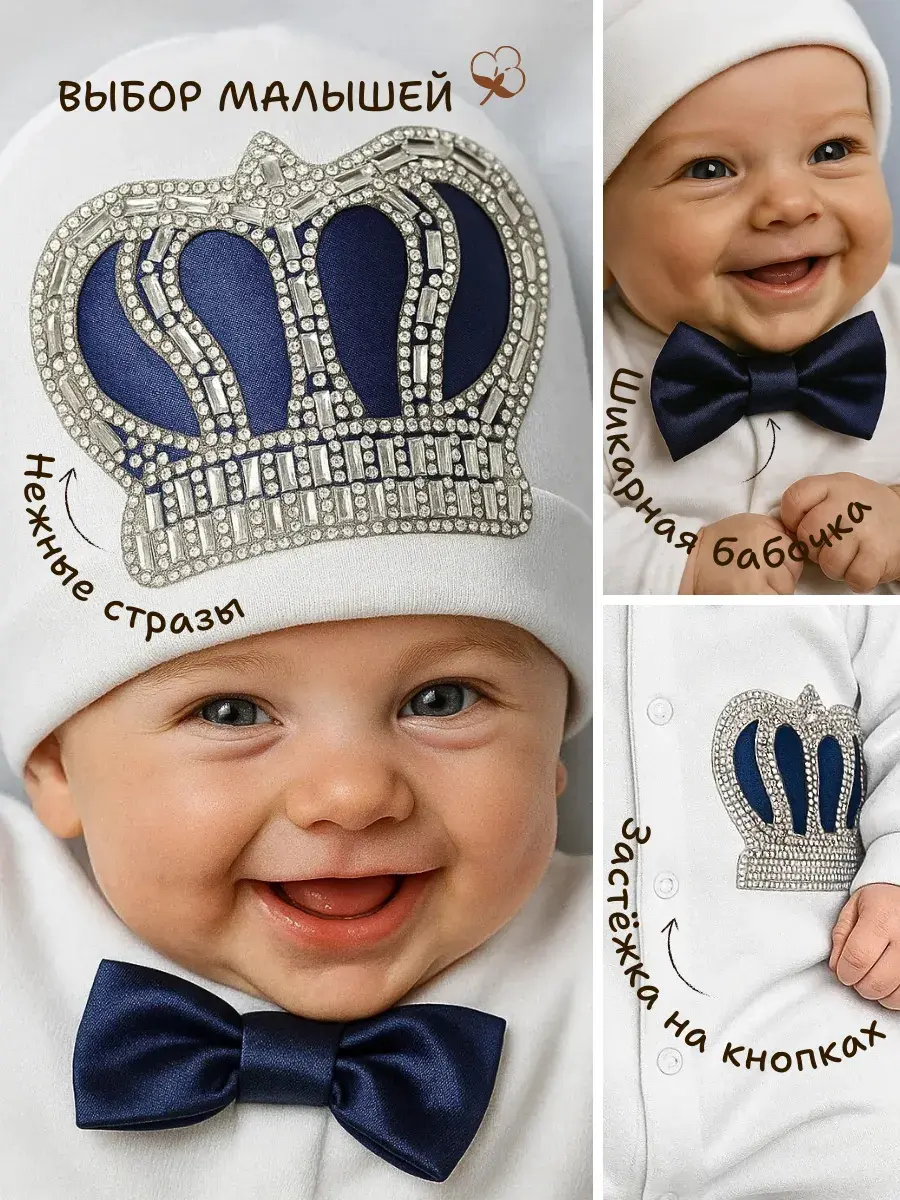 Представляем вам восхитительный комплект на выписку новорожденного от PATRINO, созданный, чтобы сделать этот особенный день еще более волшебным! Этот нарядный комплект, выполненный из нежного хлопка, окутает вашего малыша мягкостью и заботой. Слип для новорожденного с длинными рукавами и царапками обеспечит максимальный комфорт, а удобные кнопки по всей длине позволят легко менять подгузник. Корона из страз и атласные банты на шапочке добавят образу неповторимый шарм и сделают вашего малыша настоящим принцем. Этот комплект – идеальный выбор для выписки из роддома, фотосессии или просто для ежедневного использования. Он станет прекрасным подарком на рождение, порадуя молодых родителей и их кроху.