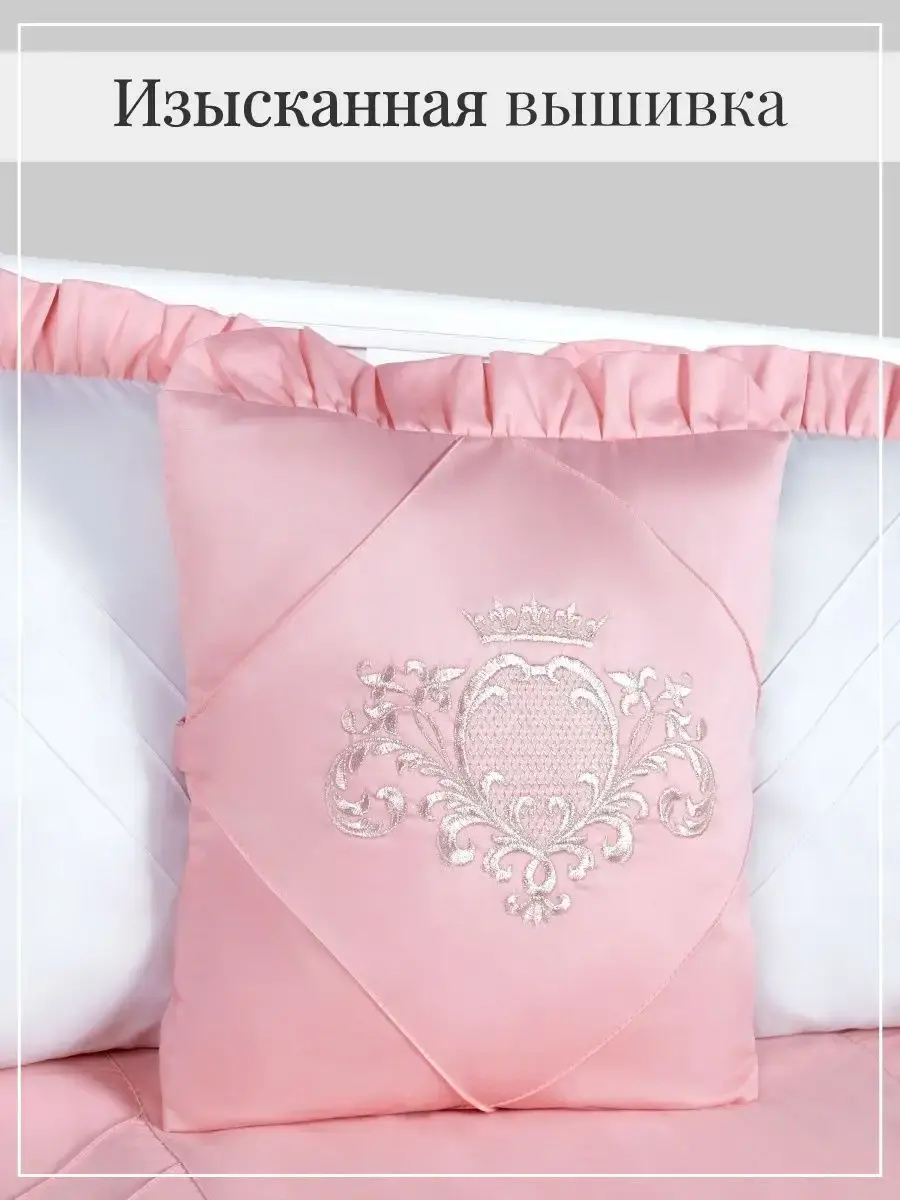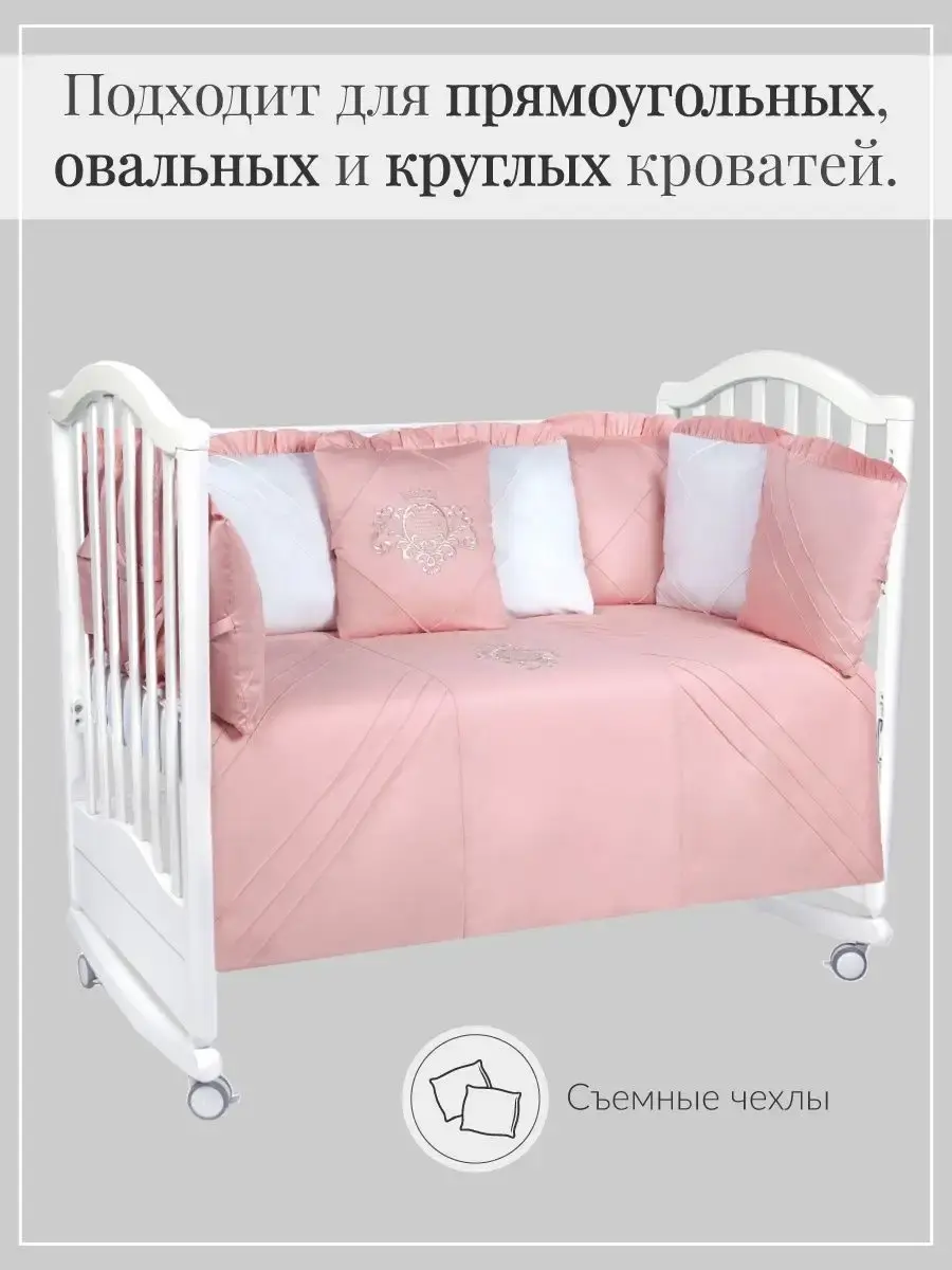 Комплект в кроватку для новорожденного ребенка от бренда PATRINO - это роскошный набор из постельного белья и бортиков в виде подушек для младенцев - грудничков и малышей постарше. В комплект входит 6 предметов: пододеяльник (100х120 см), простыня на резинке на матрас (120х60х12 см), подушка и наволочка (40х60 см), одеяло с наполнителем файбертек (100х120 см) и 12 маленьких подушечек со съемными чехлами и завязками - лентами для крепления, которые будут служить сплошным бортиком - забором вокруг спального места по периметру детской кроватки или колыбели классической прямоугольной, овальной или круглой формы. Защитное ограждение из мягких бортиков образует барьер - ограничитель, благодаря которому, маленькие дети будут чувствовать себя в безопасности, будут защищены от сквозняков и ударов ножками, ручками или головой о края кроватки или люльки, другой мебели во время сна или бодрствования. Детский набор сшит из высококачественного и дышащего хлопкового сатина Jet - 100% хлопок, радующего нежным блеском и гладкостью. Красивые стеганые подушечки - накладки бортика - заборчика декорированы бисерной строчкой, одна подушка и одеяльце украшены роскошными декоративными вензелями, выполненными машинной вышивкой 3D.